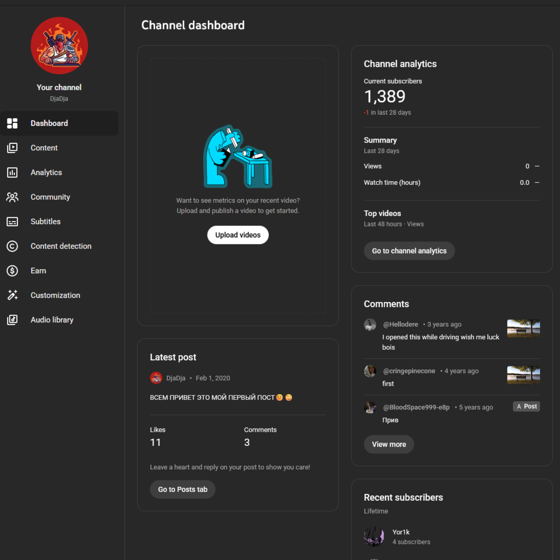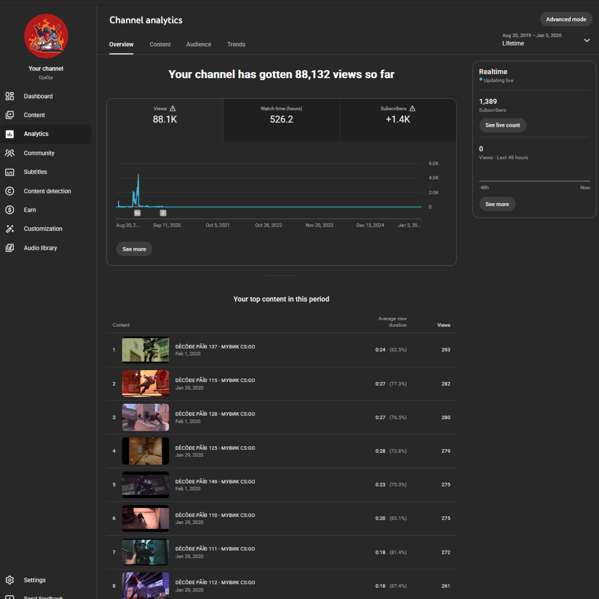 Currently, the channel has 1,389 subscribers and over 88,000 lifetime views, generated organically through gaming content and video discovery over time.