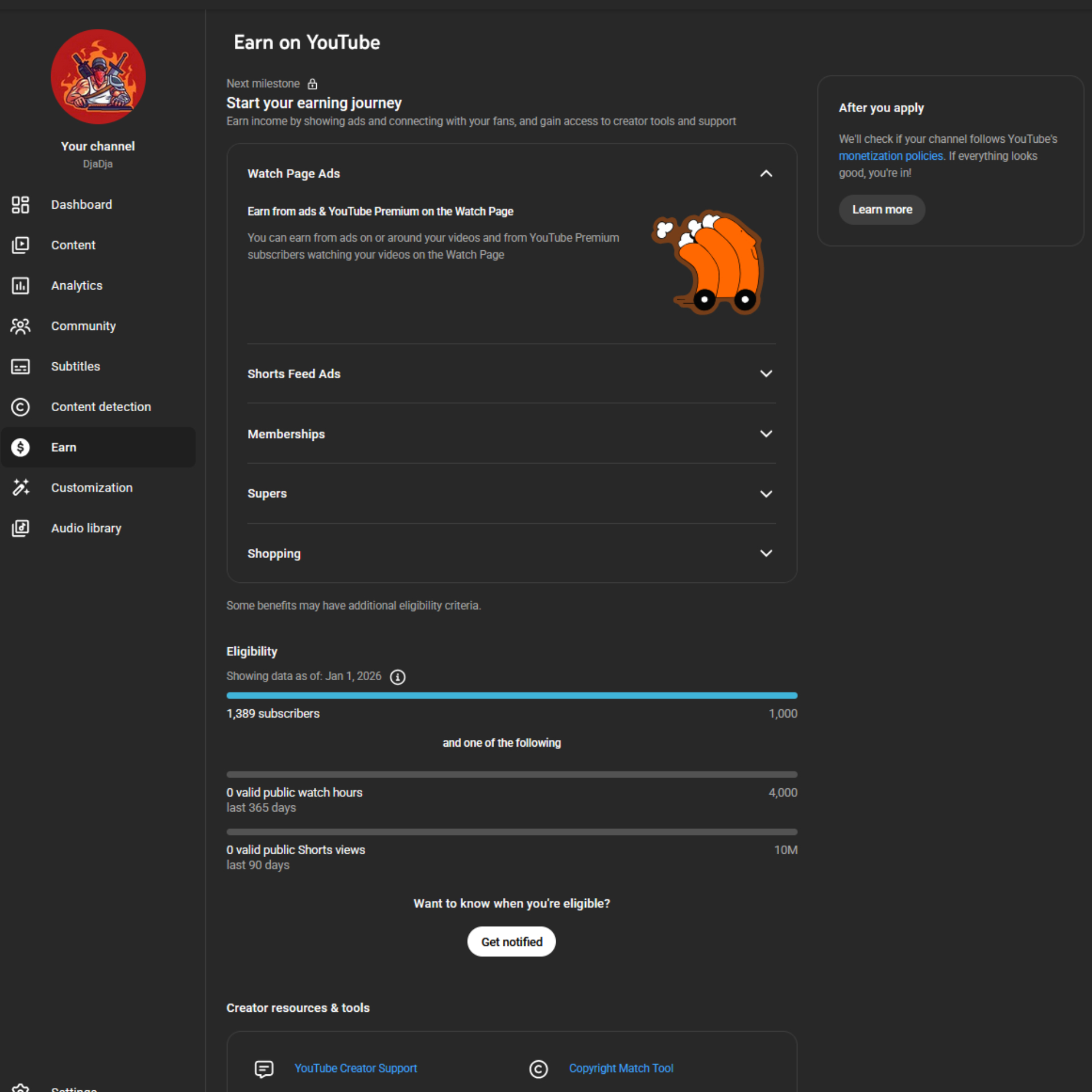 The channel already meets the subscriber requirement (1,000+), but additional public watch hours or Shorts views are required to apply for the YouTube Partner Program.