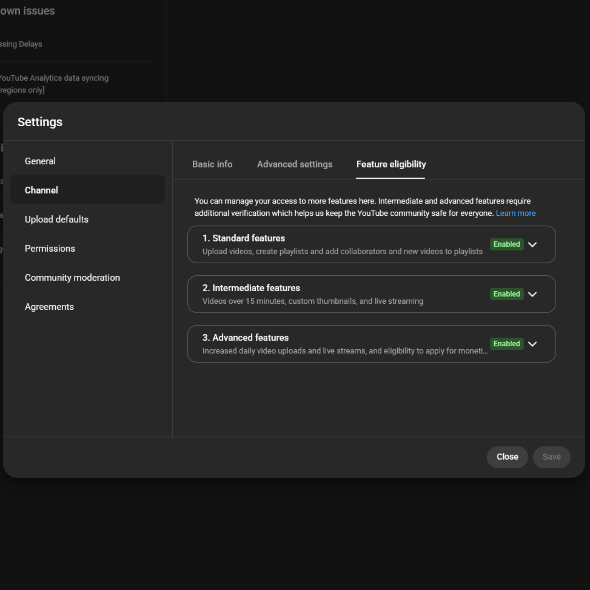 The channel has a clean history with no copyright strikes, and all Standard, Intermediate, and Advanced YouTube features are enabled, allowing full functionality and future scaling.