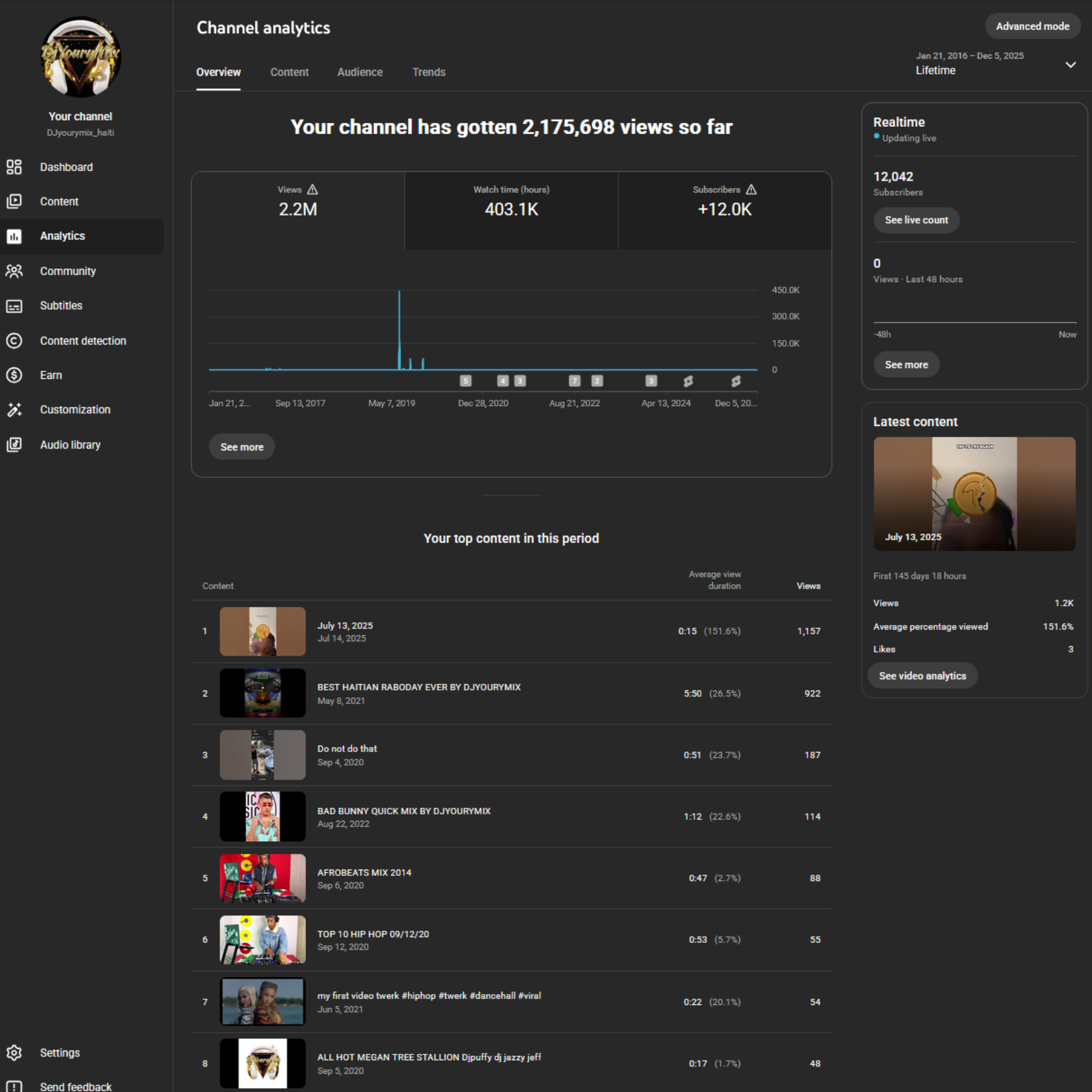 The audience is international, with strong engagement from viewers interested in DJ mixes, hip-hop, Haitian rap, Afrobeat, Caribbean music, and remix culture.