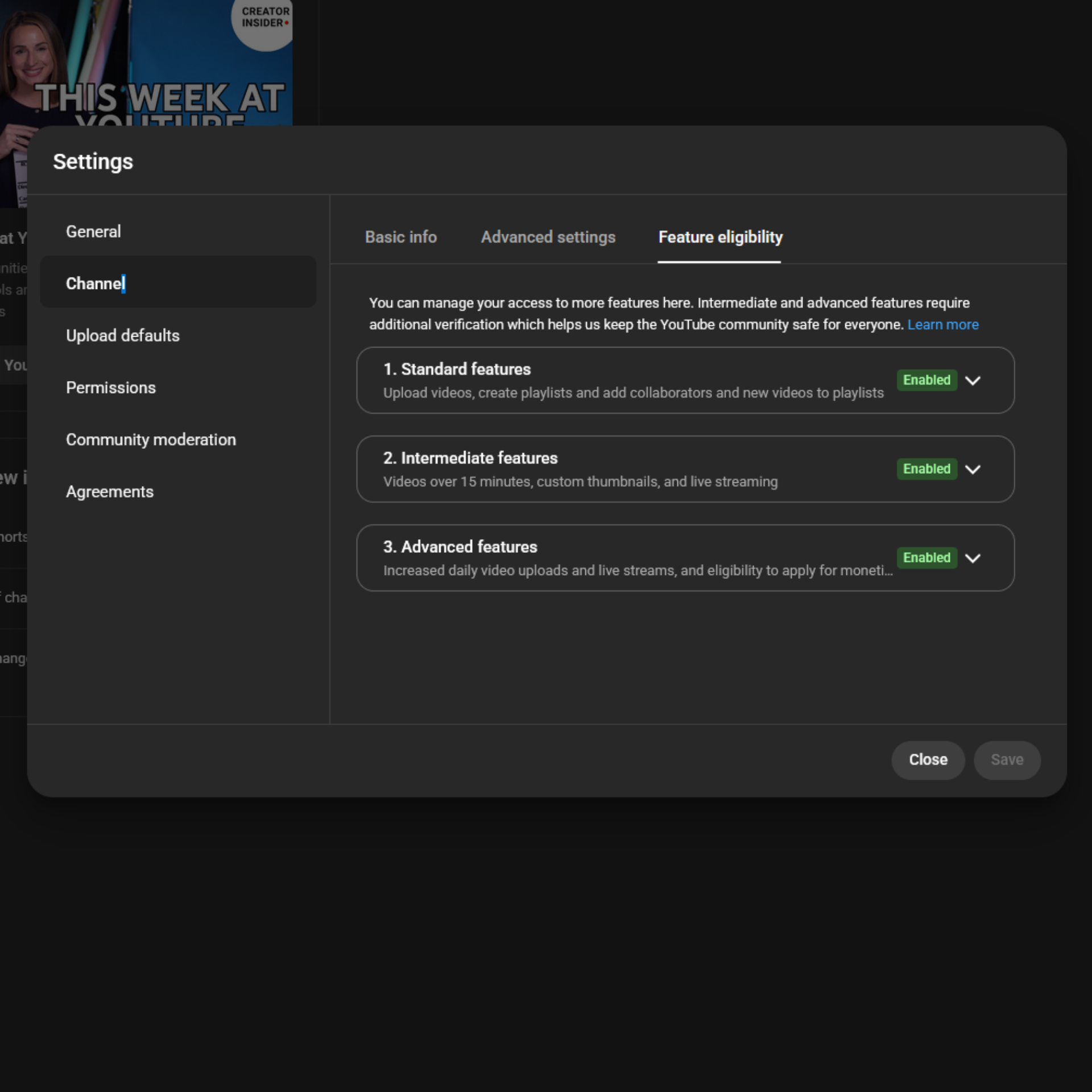 The channel has no strikes, no copyright penalties on record, and all Standard, Intermediate, and Advanced features are fully enabled.