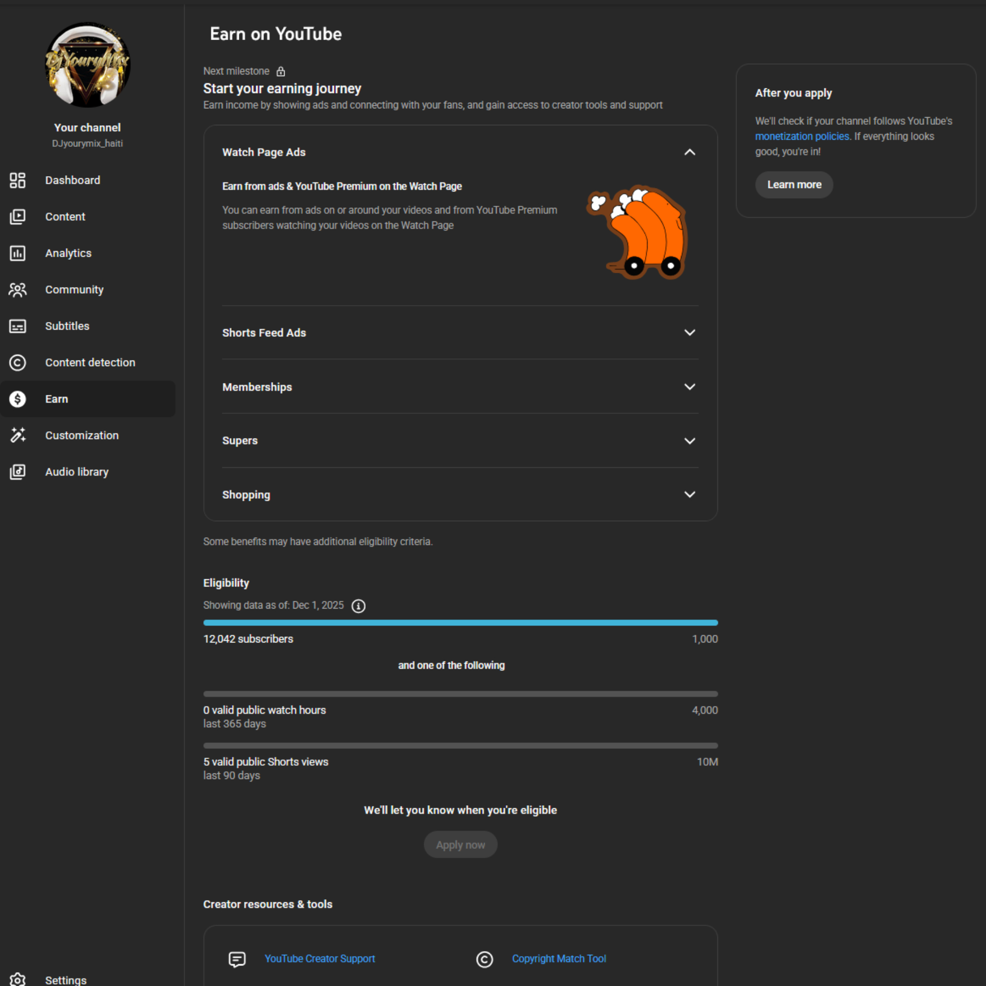 The channel already satisfies the subscriber requirement (1,000 subs), making it eligible for review after meeting watch-hours.